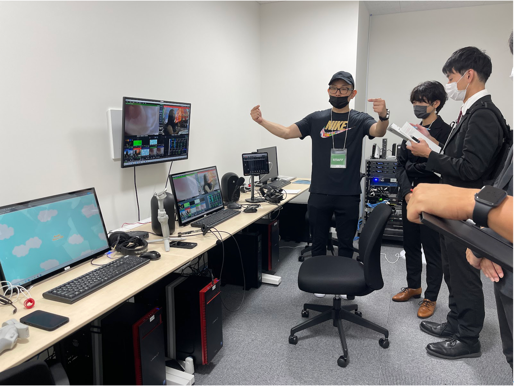 Thumb Studio体験会では、招待された関係者らがUVPやその他画像合成技術を実際に体感しました。招待客は、ユニゾンシステムズの社員らの解説を受け、思い思いに骨格検知技術や映像のスイッチングなどの体験を楽しみました。