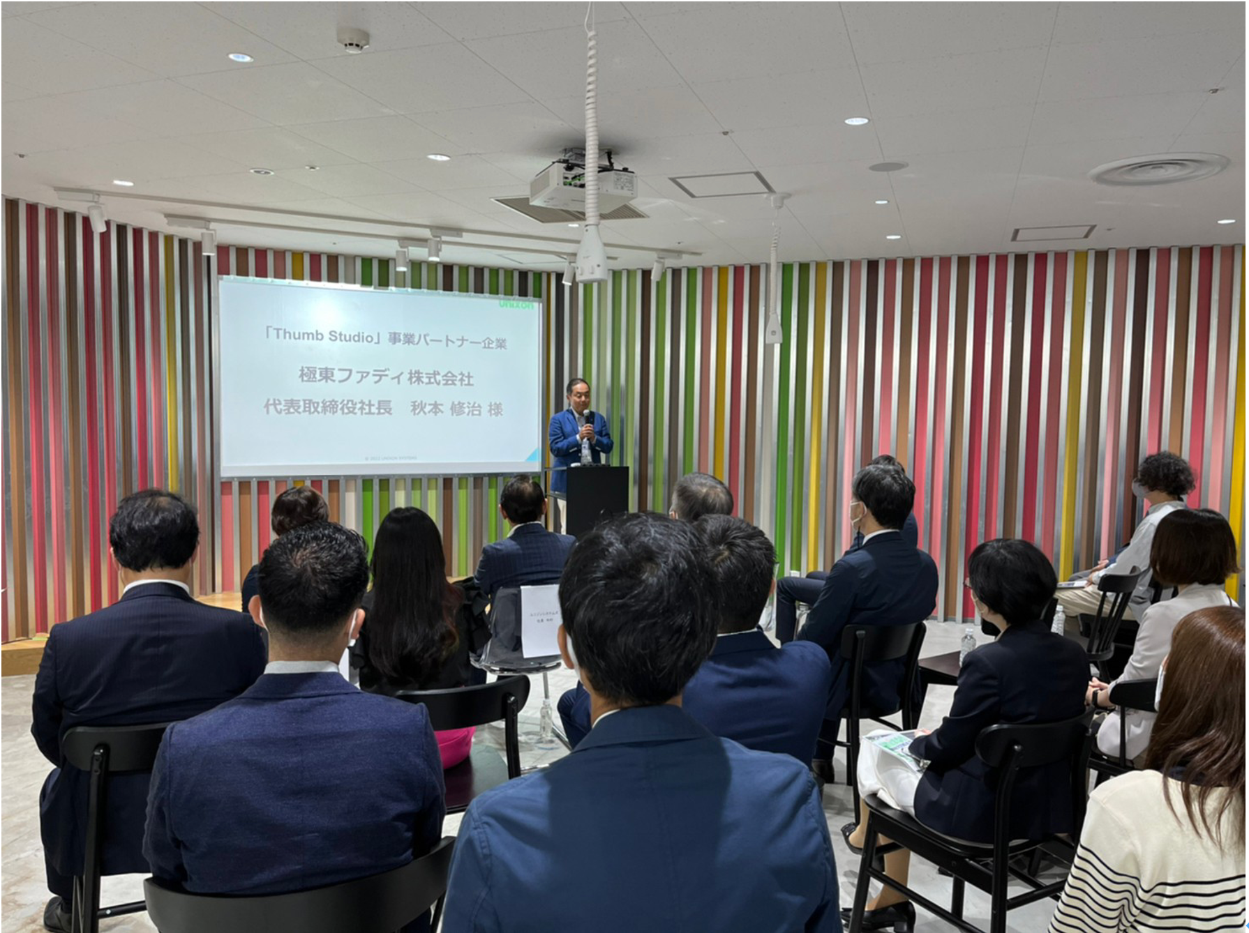 極東ファディ秋本社長は、「Thumb Studioのオープンおめでとうございます。自分たちで動画を作ろうとするとクオリティの担保が難しいので、プロデューサー、ディレクターの方々とお話しし、商品よりもお客様がその商品をどのように使っているか、ということを伝えることに焦点を当てた方が良いというアドバイスをいただきました。ゆくゆくはこちらのスタジオにロイヤルカスタマーをお呼びして、カスタマー同士の座談会のような動画を撮影したいと考えております。」と述べました。