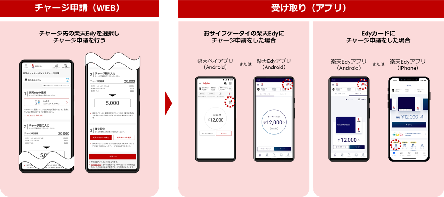 (注1)2022年10月19日時点では、「楽天Edy」マイページ(Web)と、iPhone版Edyカード用「楽天Edy」アプリからのみチャージ申請が可能です。今後、「おサイフケータイ®」機能が搭載されたAndroid版「楽天ペイ」アプリとAndroid版「楽天Edy」アプリにも対応予定です。