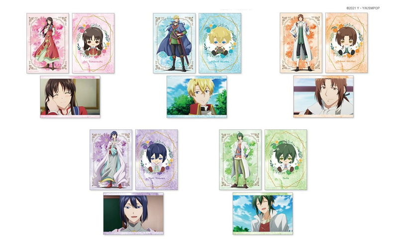 描き起こしミニキャラクターを含む登場人物5名のL判サイズのブロマイドです。3枚1セットでお届けします。
