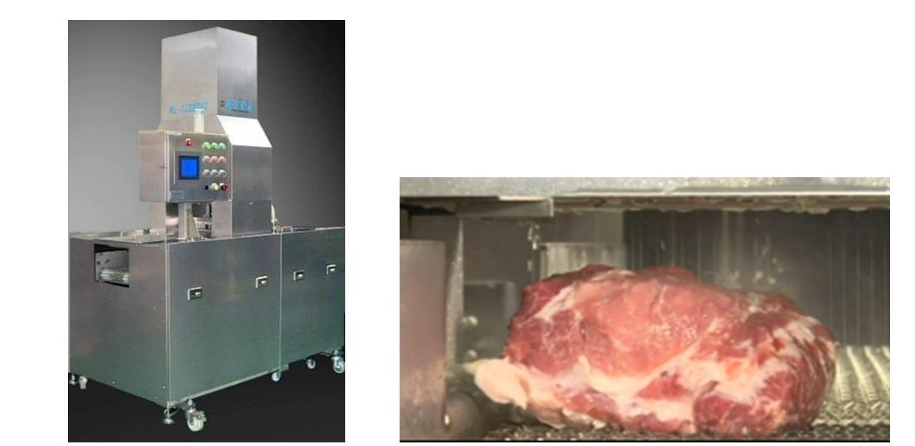 肉や魚などの食品に、水鉄砲のように高圧で調味液を飛ばして注入する装置。調味液の漬け込み時間が削減できるほか、食品に刺す針が無いため、異物混入の恐れがなく設備洗浄にかかる時間も短縮できます。