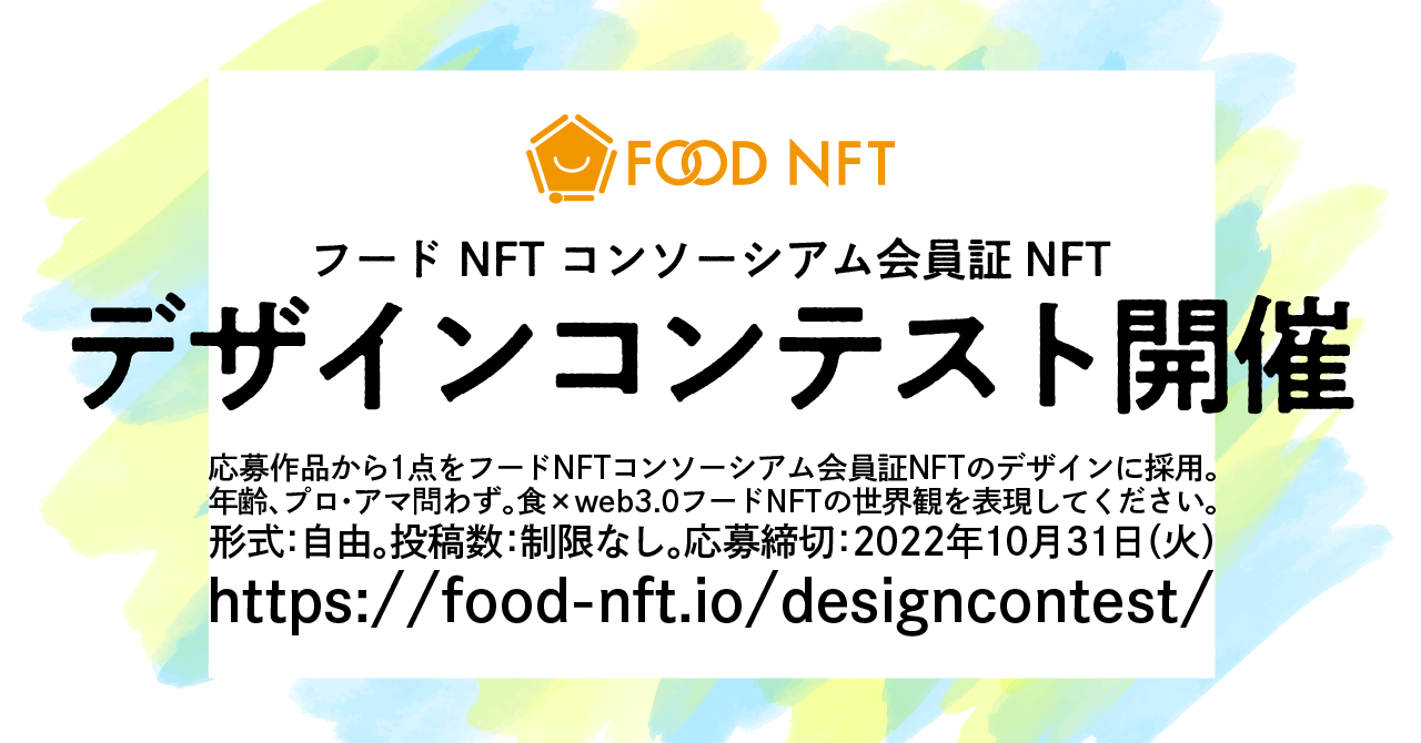 賞・賞品:応募作品から1点をフードNFTコンソーシアム会員証NFTのデザインに採用。応募作品のNFTを発行し所有権は作者が持つものとする。フードNFTコンソーシアム会員限定の特典を一部提供予定。
