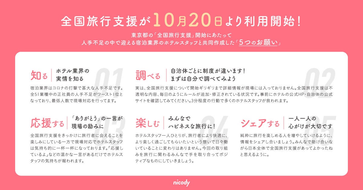 今回、旅行計画アプリ「nicody」を運営する株式会社結.JAPANとして、旅行という体験に携わる旅行者と旅行者を迎え入れる現場スタッフの皆様が気持ちよく、旅行を楽しんでいただきたいと考え、ホテルスタッフの方々の想いを汲み取りさせていただき「5つのお願い」を掲げました。