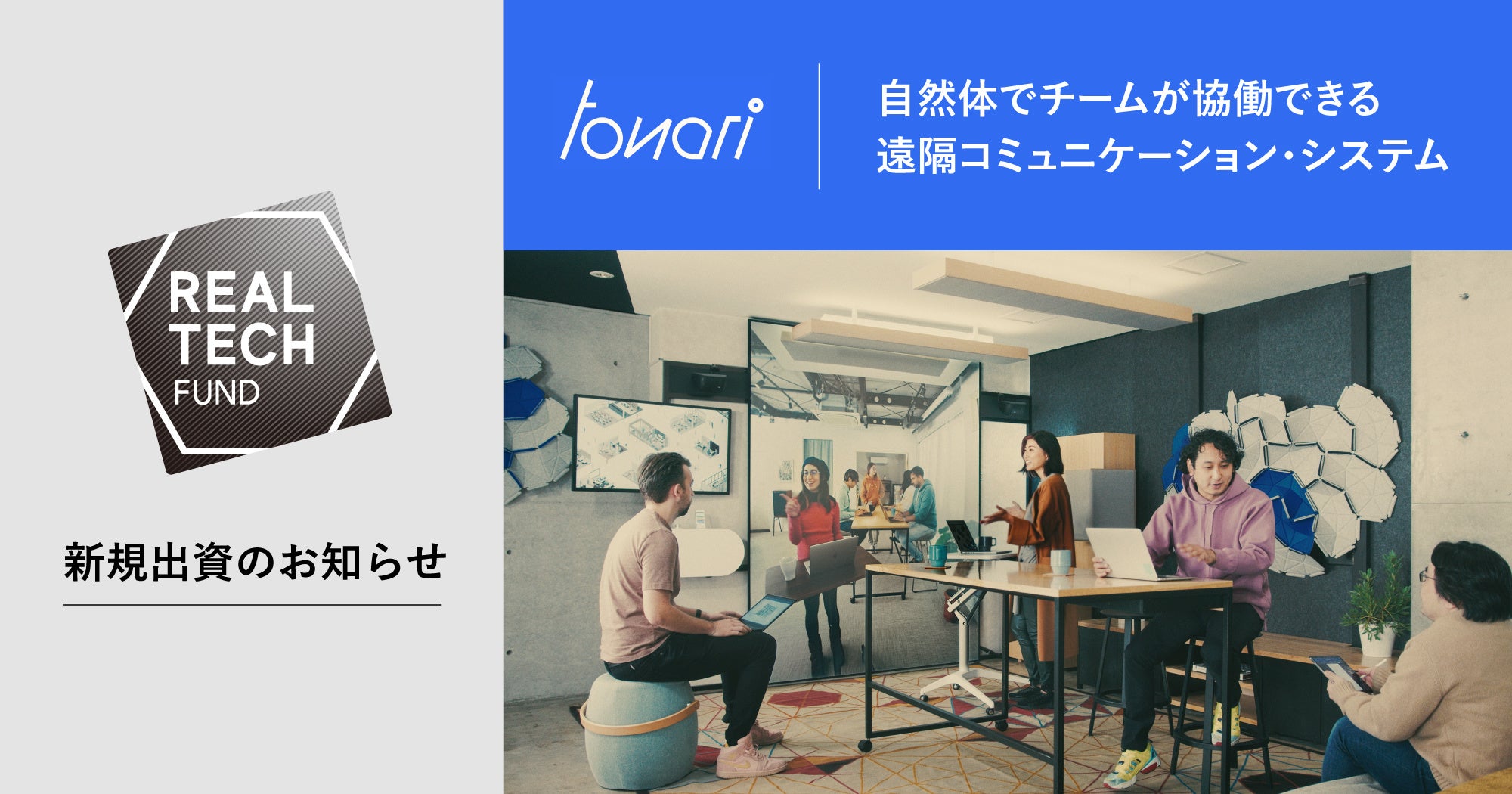 コロナ禍で加速した働き方と生活の在り方のニューノーマルを実現すべく、リアルテックホールディングス株式会社(所在地:東京都墨田区、代表:丸幸弘、永田 暁彦)が運営するリアルテックファンド*は、遠隔コミュニケーション・システムを開発するtonari株式会社(本社:東京都渋谷区、代表:タージ キャンベル、川口 良、以下tonari)へ投資を実施したことをお知らせ致します。tonariは今回の調達資金をもとに、量産体制の強化、組織拡大と国内外の認知拡大に取り組みます。