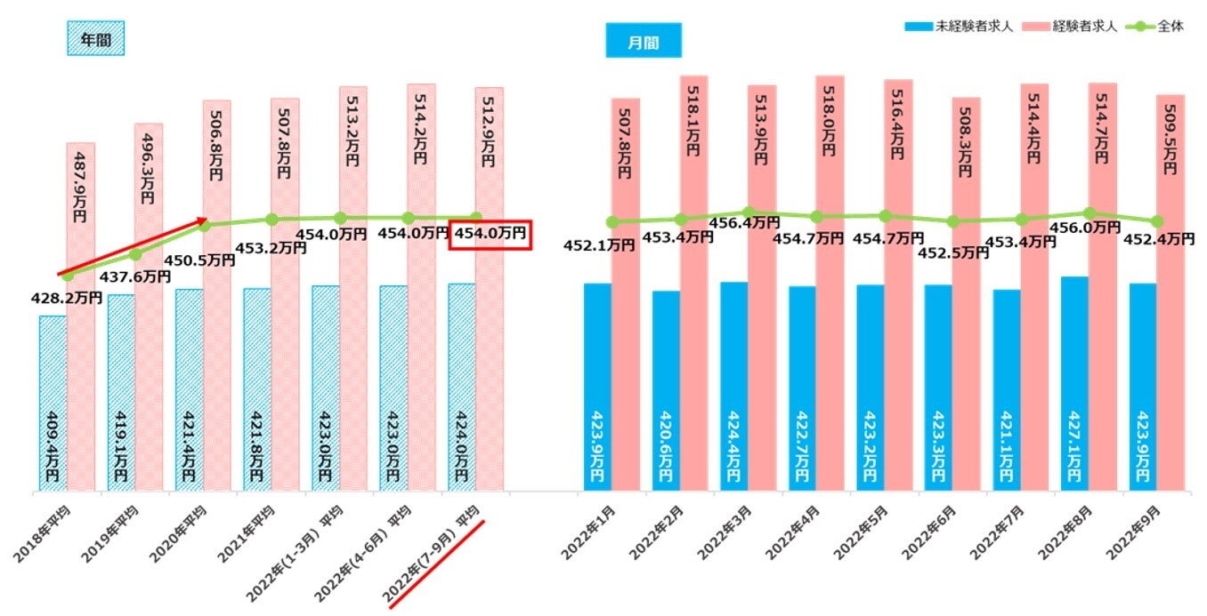 - 22年7-9月の平均初年度年収は454.0万円で高止まり。求人掲載数は2018年から140.0%増加し、企業の採用意欲の高まりが顕著に【図1、2、3】