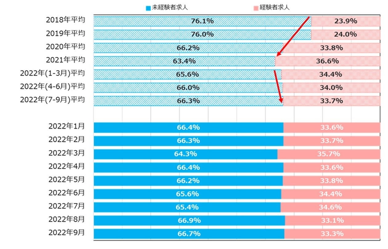 求人件数は2018年平均と比較して140.0%に増えた。月ごとにばらつきはあるものの、2021年以降掲載数は増加傾向にあり、企業の採用意欲の高まりが顕著に見られる。掲載求人の募集条件比率の年間平均は、未経験者求人が66.3%、経験者求人が33.7%だった。2021年までは経験者求人が増加傾向にあったが、2022年以降微減した。【図2、3】