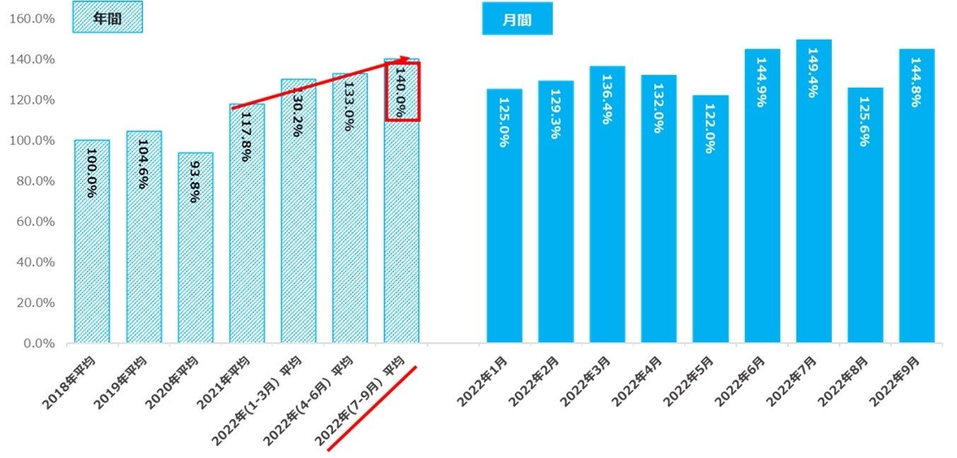- 22年7-9月の平均初年度年収は454.0万円で高止まり。求人掲載数は2018年から140.0%増加し、企業の採用意欲の高まりが顕著に【図1、2、3】