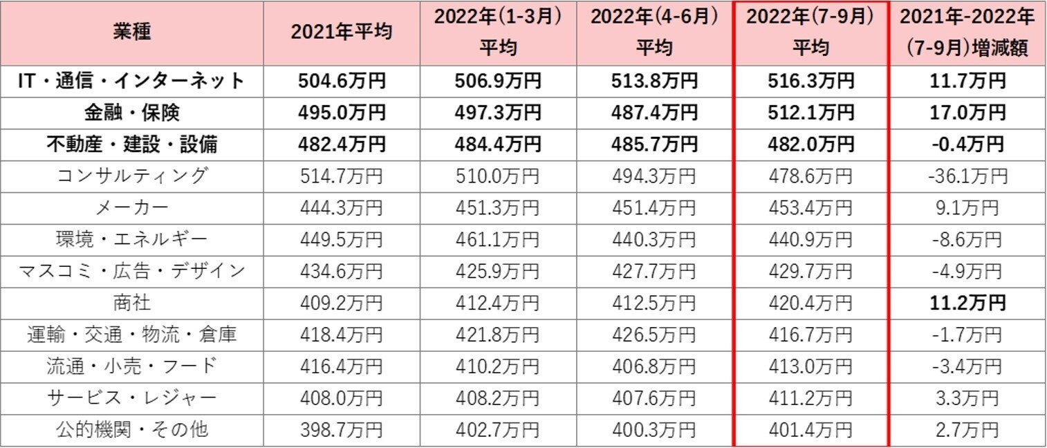 正社員の平均初年度年収を業種別にみると、「IT・通信・インターネット」が最も高く516.3万円、次いで「金融・保険」が512.1万円、「不動産・建設・設備」が482.0万円となった。2021年平均と比較して、2022年7-9月平均の最多増加額は「金融・保険」で17.0万円増。次いで「IT・通信・インターネット」が11.7万円増、「商社」は11.2万円増だった。【図4】