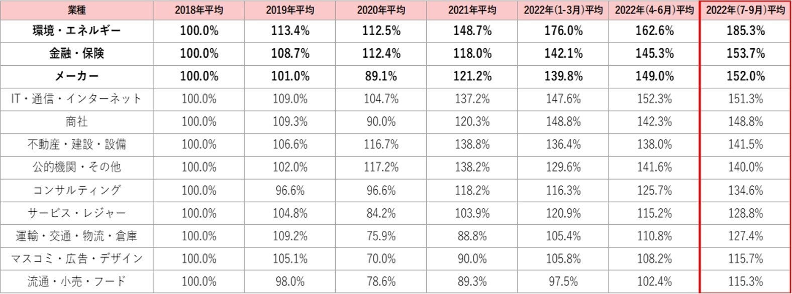 掲載数について、2018年平均から2022年7-9月で最も増加率が高い業種は「環境・エネルギー」で185.3%、次いで「金融・保険」で153.7%、「メーカー」で152.0%だった。