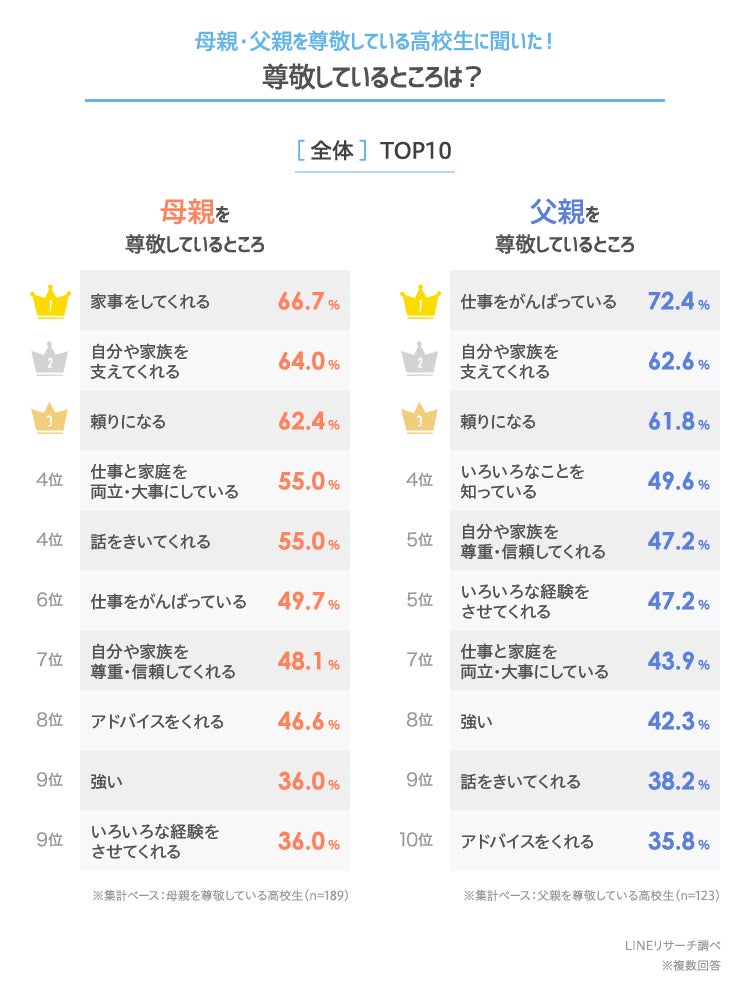 ■母親を尊敬しているところは「家事をしてくれる」が1位、父親を尊敬しているところは「仕事をがんばっている」が1位