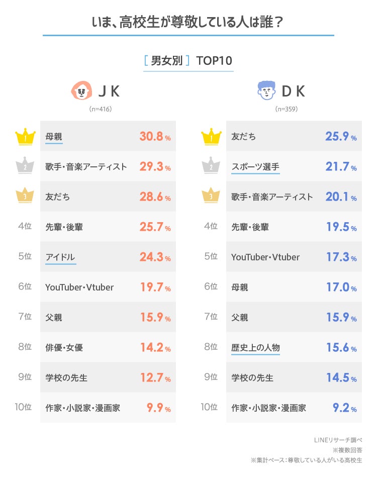 一方、男子高生でもっとも割合が高かったのは「友だち」で2割超となりました。次いで「スポーツ選手」が2割強で続きました。また、「歴史上の人物」の割合も女子高生より高く、2割弱なりました。
