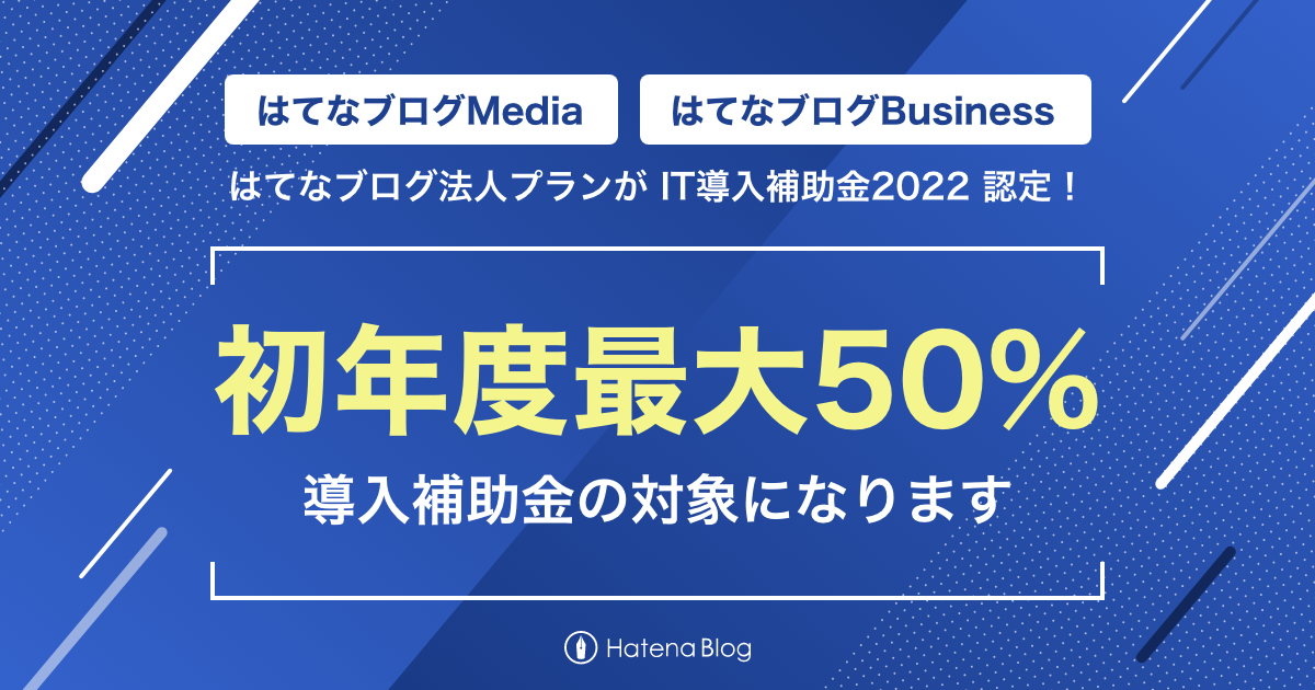これにより、IT導入補助金の補助対象となる中小企業・小規模事業者には、「はてなブログMedia」「はてなブログBusiness」の初期費用および12か月分の月額費用のうち最大50%の補助が適用されます。