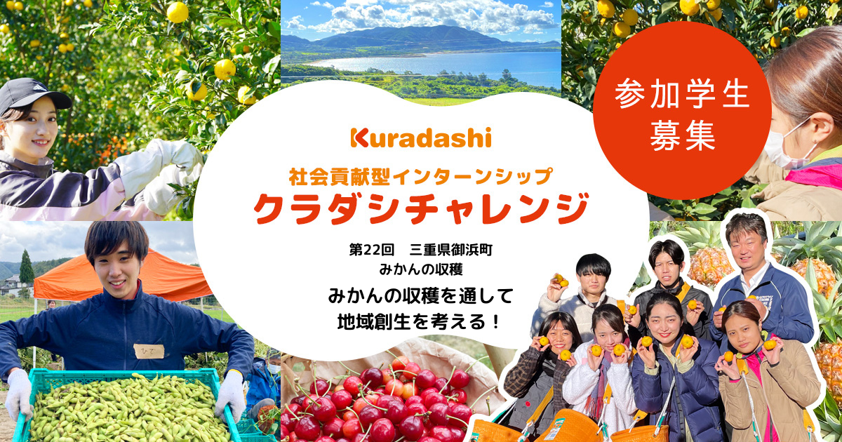 このたび、新たに12月に三重県御浜町でみかんの収穫やみかんジュースのラベル考案を行うクラチャレを実施することとなりましたので、学生の募集を開始いたします。
