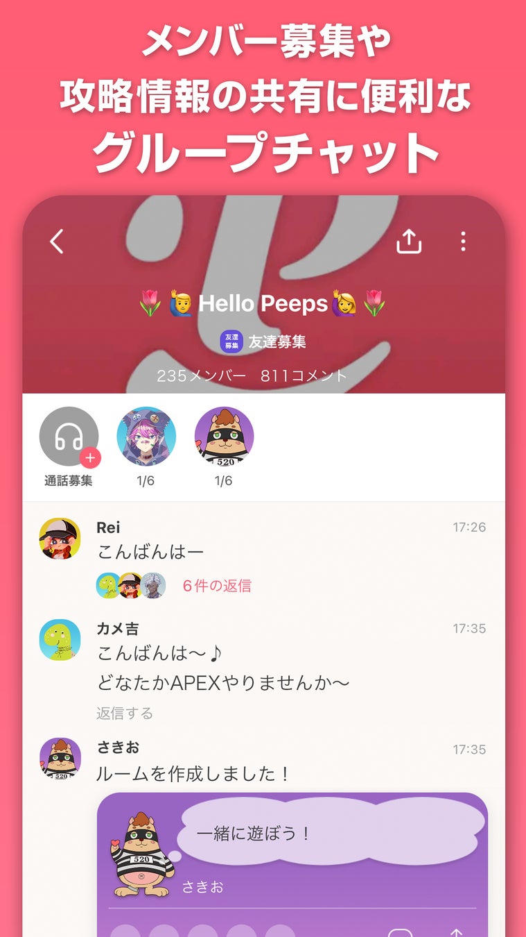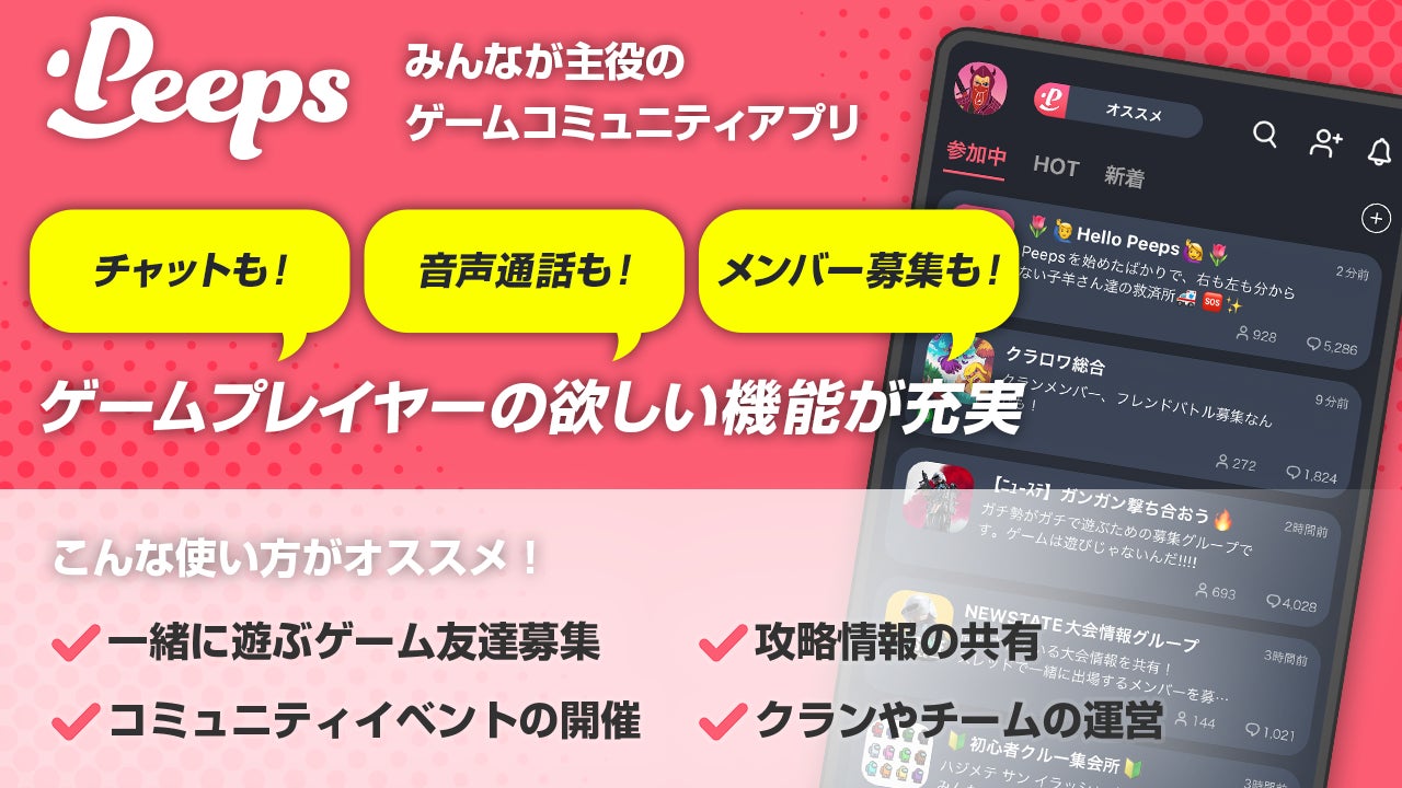 Peeps(ピープス)は、ゲームを今より楽しく遊び合う、みんなが主役の「グループコミュニケーション」アプリです。ゲームチャンネルごとに簡単検索やチャット、通話に加え、ゲームを一緒にプレイする友達の募集や、ご自身が所属するチームの運営に役立つ便利なグループ機能が充実しております。