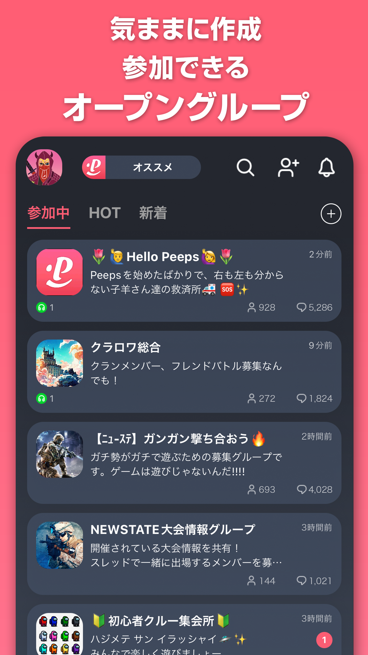 Peeps(ピープス)は、ゲームを今より楽しく遊び合う、みんなが主役の「グループコミュニケーション」アプリです。ゲームチャンネルごとに簡単検索やチャット、通話に加え、ゲームを一緒にプレイする友達の募集や、ご自身が所属するチームの運営に役立つ便利なグループ機能が充実しております。