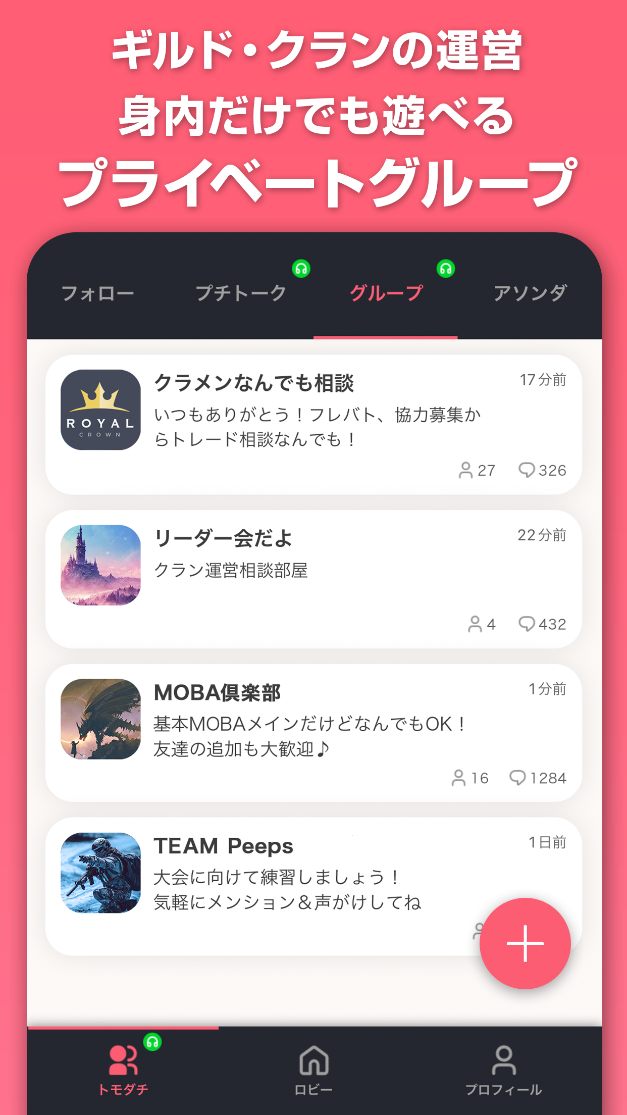 グループは、ゲームの友達募集や攻略情報の共有などに便利なオープングループと、チームやクラン、イベントの運営に便利なトモダチグループを用途に合わせてご利用いただけます。