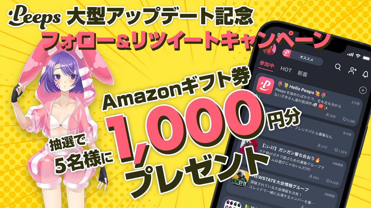 Peeps大型アップデートを記念して、Twitter内でフォロー&リツイートしていただいた方の中から抽選で5名の方に、1,000円分のAmazonギフト券をプレゼントするキャンペーンを実施しております。