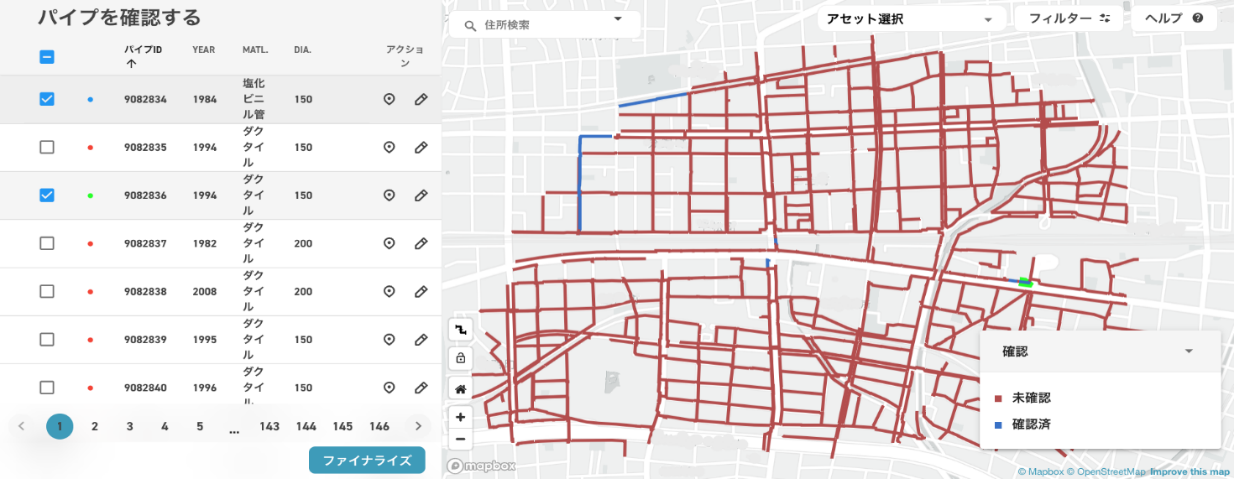 実際の自治体のデータを用いて行った検証では、布設年度を誤差±5年以内で推定できた管路が全体の90%程度となり、管種、口径の推定精度も8割以上と高い正解率となり、有効性が実証されております。
