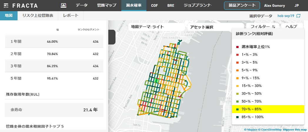 今回実装される新機能「余寿命予測」では、これまでAI/機械学習によって算出された「診断後1~5年以内の水道管破損確率」に加え、新たに管路ごとの「余寿命(次回漏水が発生するまでの期間)」が算出できるようになります。これにより、自治体・水道事業者はより具体的な更新計画の策定、長期的なアセットマネジメントの推進が可能となります。
