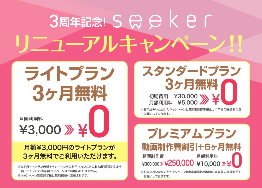 「seeker」3周年を記念し、歯科医院様に対し、謝恩キャンペーンをご用意いたしました。
