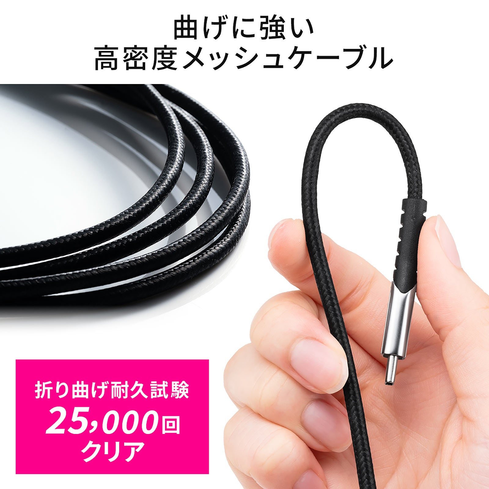 折り曲げ試験25,000回、荷重試験70kgをクリアした優れた耐久性を持っています。USB Power Delivery(USB PD)による最大100W(DC20V/5A)の出力に対応しています。ポリエチレン製のメッシュ被覆が摩擦によるシースの破れを防ぎます。