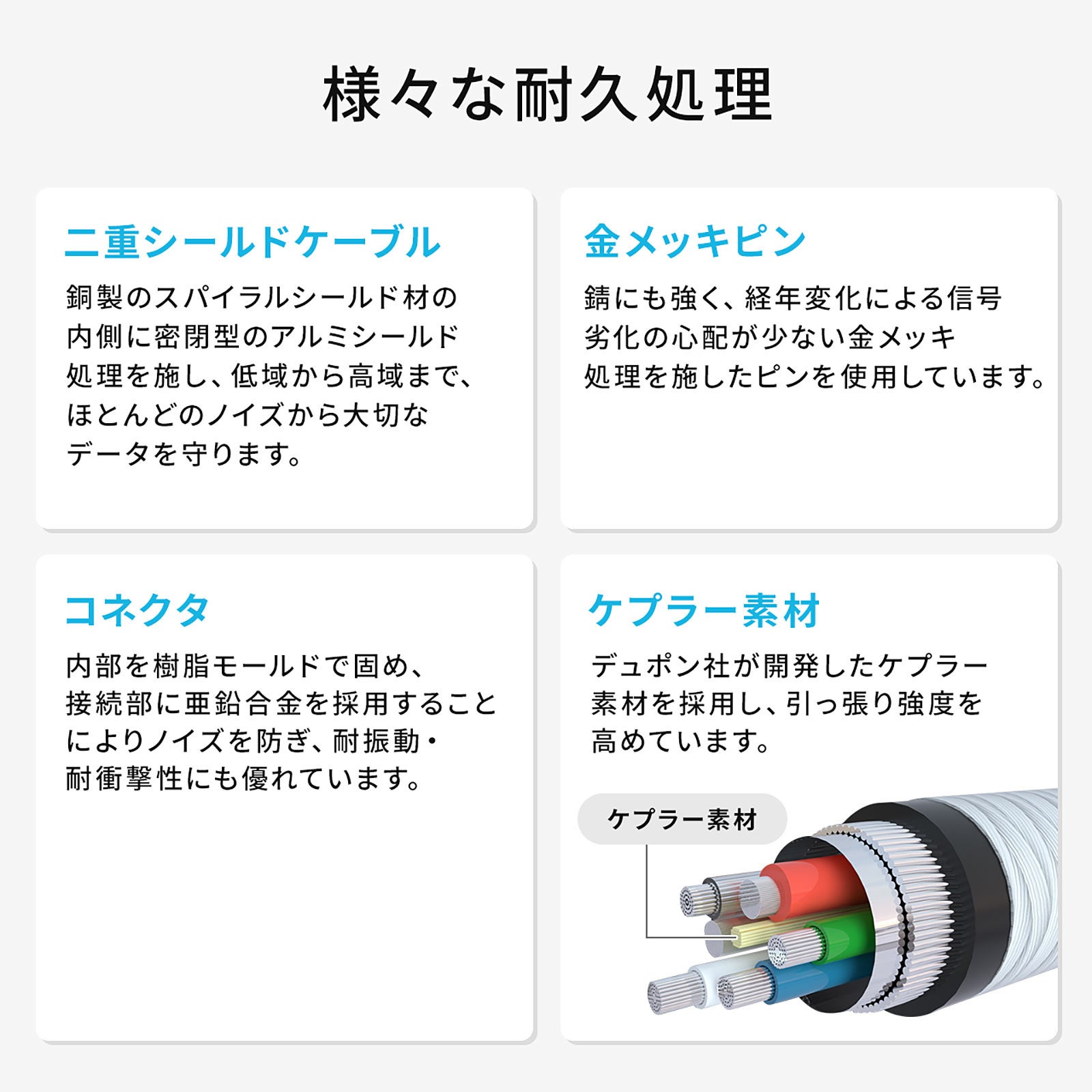 防弾チョッキの素材にも用いられる軽くて丈夫なケブラー繊維をケーブル内部に使い、引っ張りによる断線を防止します。