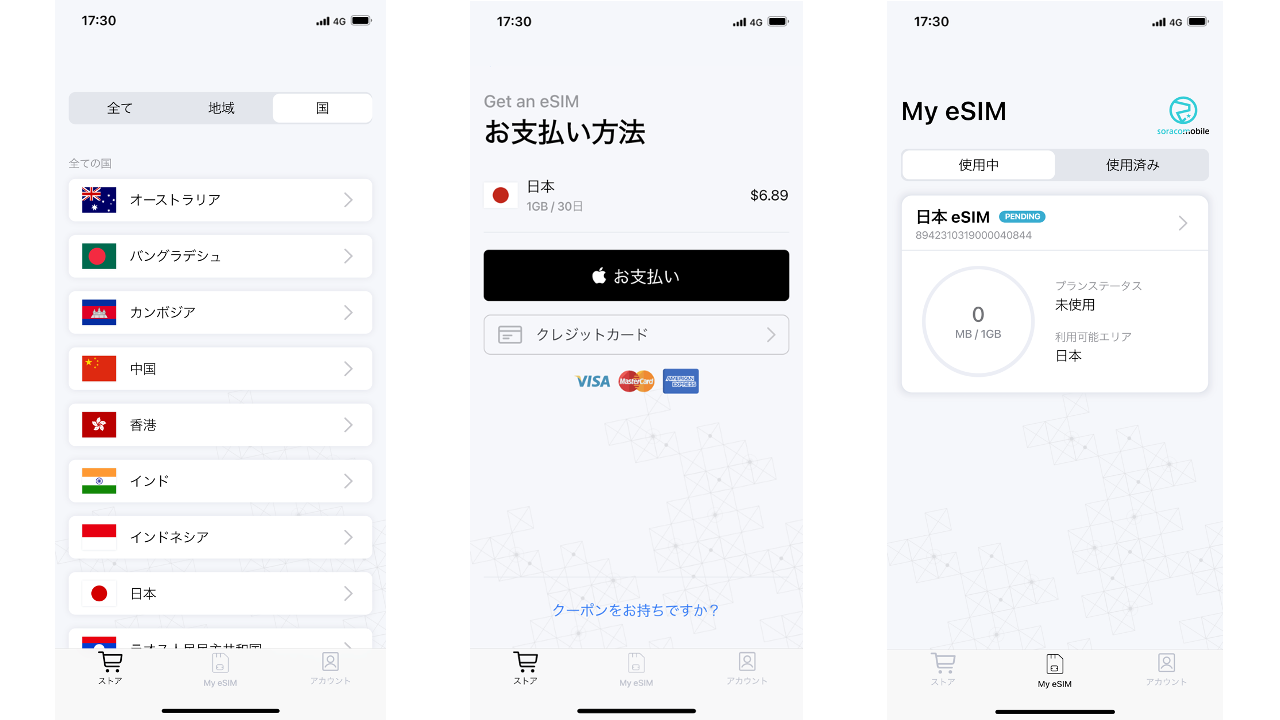 Soracom Mobileは、アメリカ・ヨーロッパ・オセアニア・日本を含むアジアをカバーするeSIMのデータ通信プランを提供しています。複数の国でご利用いただける周遊プランと、特定の国でご利用いただける国別プランがあり、プリペイド型で30日間で1、3、5、10GBのデータ通信量のプランをご利用いただけます。QRコードの用意やAPNやローミング設定も一切不要、Apple Payで決済でき、アプリの中でeSIMプロファイルの購入から設定まで完結できる使いやすさが特徴です。