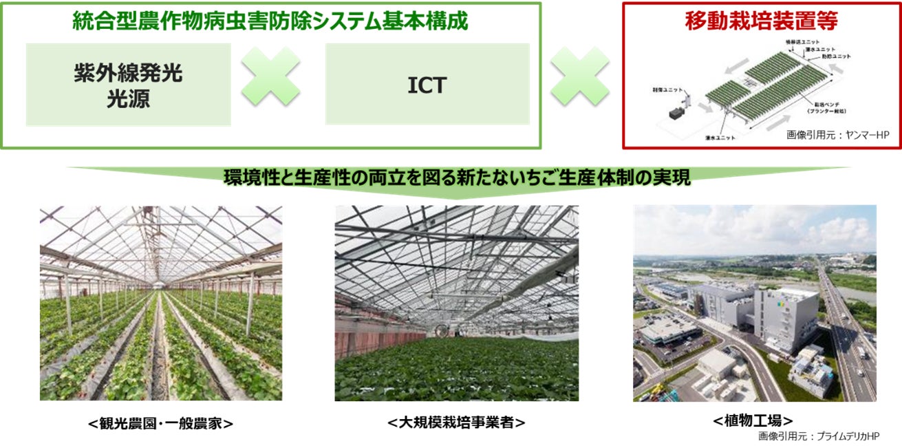 ヤンマーグリーンシステムが提供するイチゴ移動栽培装置※2を中心とした次世代型生産設備が導入されている熊本県内にあるプライムデリカ所有の圃場を実証フィールドにして取り組みます。今回、当該圃場において、物理的な防除技術として期待される「紫外線発光光源」を用い、NTT東日本が各種試験データの取得と分析をする実証を行います。この実証により、環境負荷低減と持続的な農業生産を実現することを目的とする、化学農薬の使用量およびリスクを低減させた安心・安全なイチゴ※3の生産・安定供給を実現する次世代型スマート防除技術の確立をめざします。