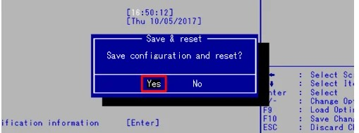 Step3:F10キーを押し、「Save configuration and reset?」と表示されたら「Yes」を選択して、Enterキーを押せば完了です。