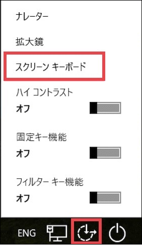 Step1:ログイン画面の右下に表示される「コンピュータの簡単操作」のアイコン(時計のようなアイコン)>「スクリーンキーボード」の順にクリックします。