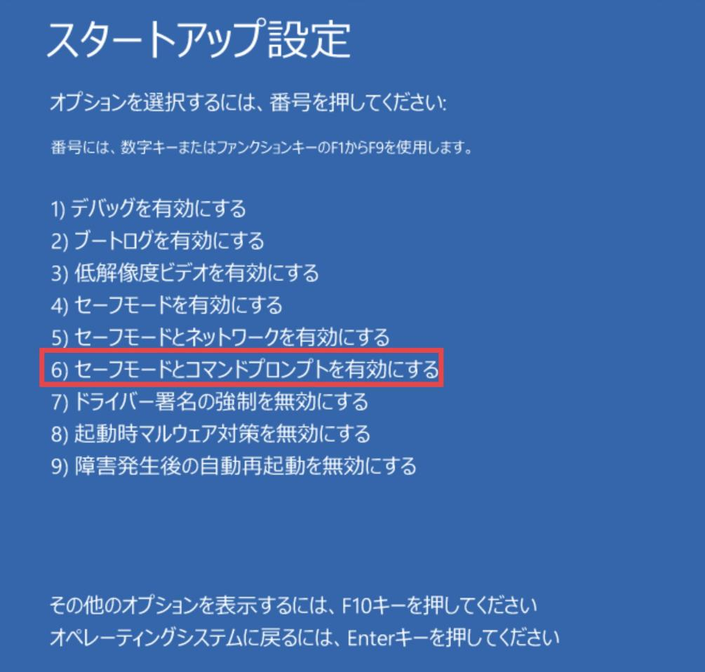 Step2:「オプションを選択してください」という画面が表示されますので、「トラブルシューティング」>「詳細オプション」>「スタートアップ設定」>「再起動」>「6)セーフモードとコマンドプロンプトを有効にする」の順にクリックします。