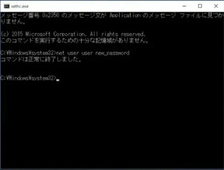 Step3:コマンドプロンプトで、「C:¥Windows¥System32>」の後に「net user 〔ユーザー名〕 〔新しいパスワード〕」と入力して、Enterキーを押すとパスワードをリセットできます。