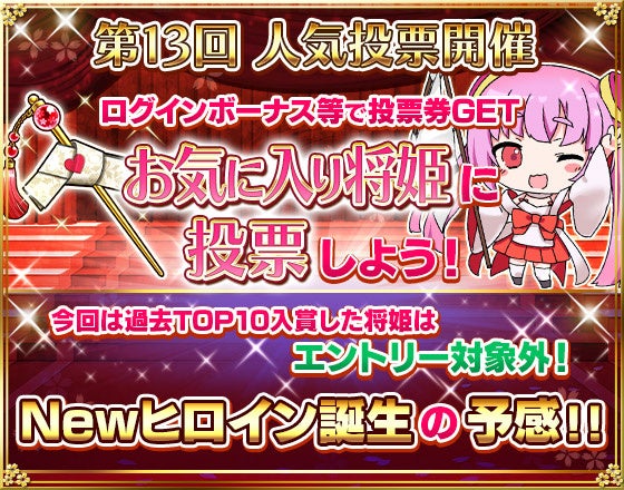 今回のテーマは「Newヒロイン誕生」です♪ これまでTOP10入賞経験のない将姫が対象です、この機会に新しい推しを見つけましょう〜☆投票券はイベント等で獲得できます。投票数に応じて「人気投票ガチャ券」がもらえます!さらに人気投票ガチャでは「未獲得」の将姫を獲得できちゃいます!?