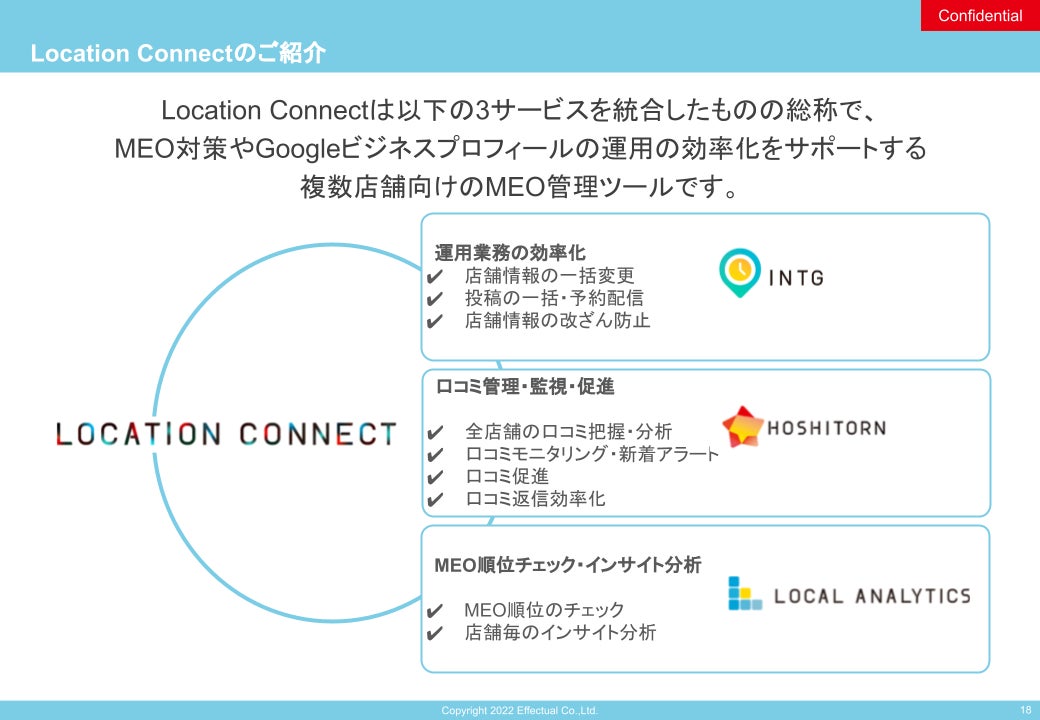 エフェクチュアルが提供する「Location Connect」(ロケーションコネクト)は、個店から複数店舗展開する企業にご導入頂いている、Googleビジネスプロフィールの運用をDX化するSaaS型クラウドサービスです。