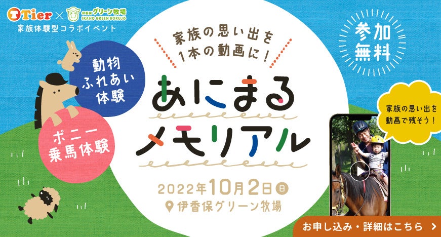 株式会社Tier(本社:東京都港区、代表取締役:藪内健吾)は、動物好きによる動物好きのために作られたSNSアプリ『Tier(ティア)』(https://tier-family.co.jp/)のリリースを記念し、株式会社伊香保グリーン牧場(以下『伊香保グリーン牧場』)との共同開催で、初のイベントとなる”あにまるメモリアル”を2022年10月2日(日)に開催いたしました。2組のご家族をご招待し、動物と触れ合う様子を動画にしてプレゼントしました。