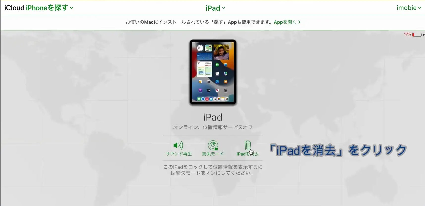 「探す」機能がオンになっている場合、iCloudを使ってデバイスを初期化することができます。iCloudを使えば、デバイスをリモート消去し、工場出荷状態にリセットすることができます。この機能を使うには、まずiPadの電源がオンになっていて、ネットワークに接続されていることを確認する必要があります。そうしないと、iPadをリモート消去することはできません。