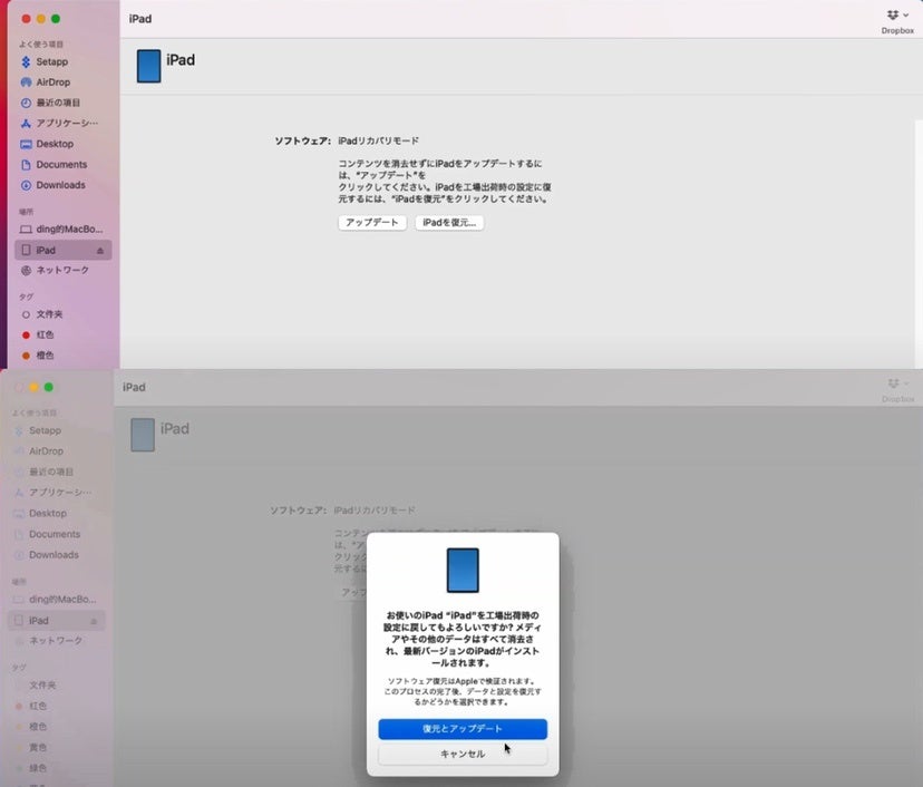 ④同期・バックアップ終了後、「iPadを復元」をクリックします。