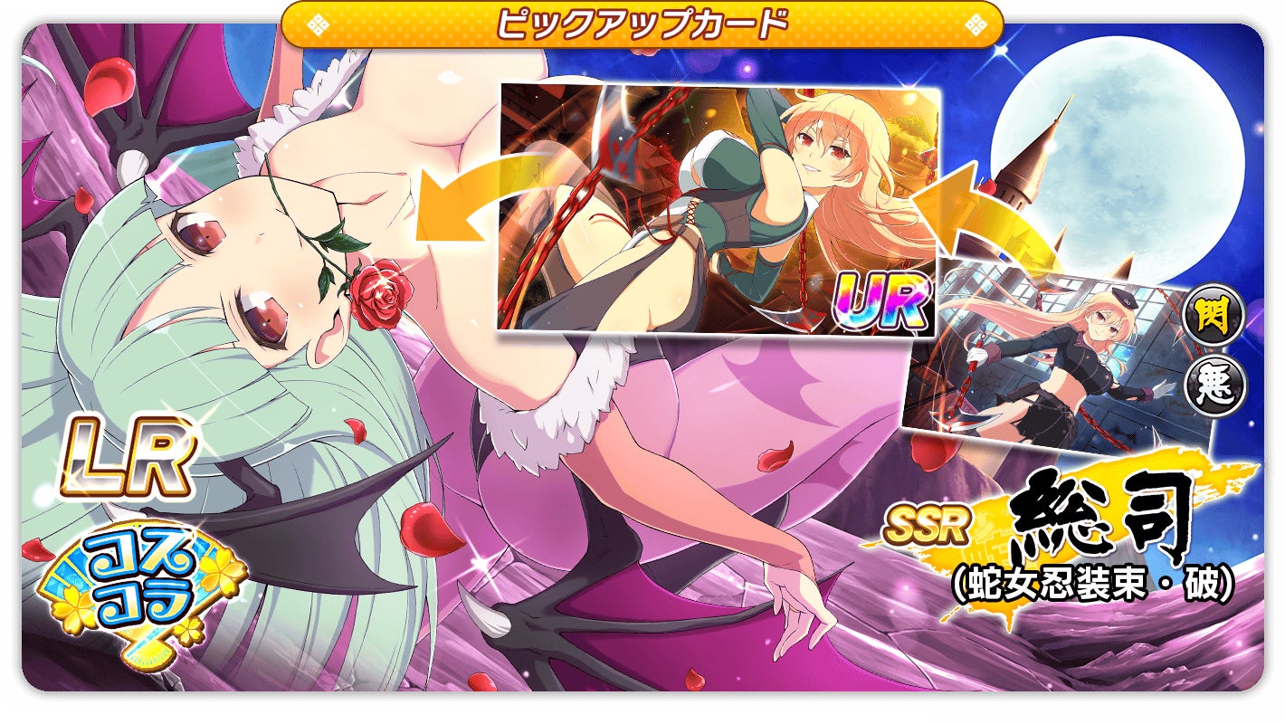 「ヴァンパイアコラボレジェンドガチャ」では、閃乱覚醒すると「モリガン」の姿になる「総司」の新カードがLRで登場!