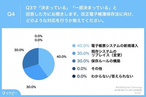 Q3で「決まっている」「一部決まっている」と回答した方に、「Q4.改正電子帳簿保存法に向け、どのような対応を行うか教えてください。」(n=10)と質問したところ、「電子帳票システムの新規導入」が40.0%、「既存システムのリプレイス(変更)」が30.0%という回答となりました。