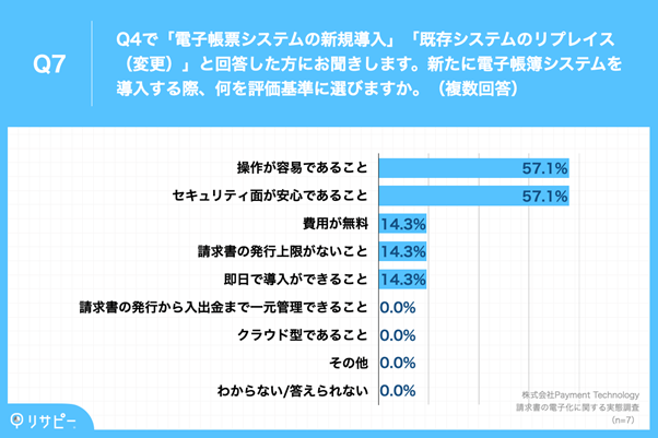 Q4で「電子帳票システムの新規導入」「既存システムのリプレイス(変更)」と回答した方に、「Q7.新たに電子帳票システムを導入する際、何を評価基準に選びますか。(複数回答)」(n=7)と質問したところ、「操作が容易であること」が57.1%、「セキュリティ面が安心であること」が57.1%という回答となりました。