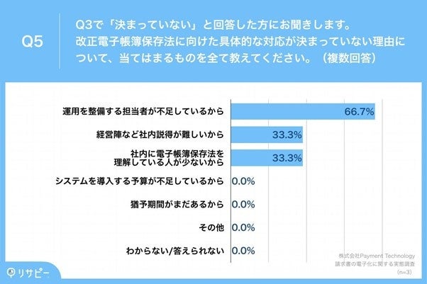 Q3で「決まっていない」と回答した方に、「Q5.改正電子帳簿保存法に向けた具体的な対応が決まっていない理由について、当てはまるものを全て教えてください。(複数回答)」(n=3)と質問したところ、「運用を整備する担当者が不足しているから」が66.7%、「経営陣など社内説得が難しいから」が33.3%、「社内に電子帳簿保存法を理解している人が少ないから」が33.3%という回答となりました。
