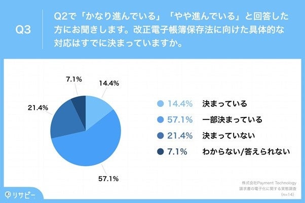 Q2で「かなり進んでいる」「やや進んでいる」と回答した方に、「Q3.改正電子帳簿保存法に向けた具体的な対応はすでに決まっていますか。」(n=14)と質問したところ、「決まっている」が14.4%、「一部決まっている」が57.1%という回答となりました。