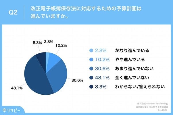 「Q2.改正電子帳簿保存法に対応するための予算計画は進んでいますか。」(n=108)と質問したところ、「あまり進んでいない」が30.6%、「全く進んでいない」が48.1%という回答となりました。