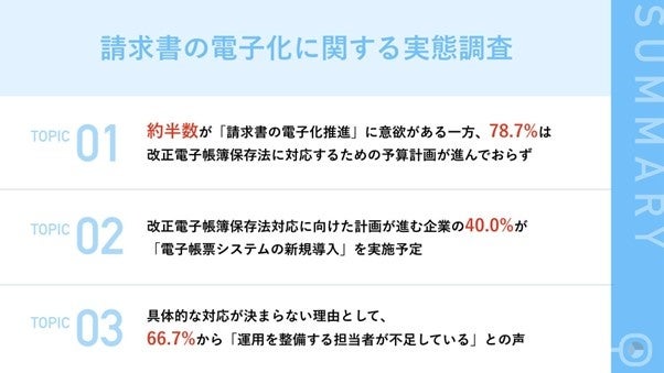 改正電子帳簿保存法に未対応の担当者の約半数が、今後の「請求書の電子化推進」に意欲を示す一方で、電帳法に対応するための予算計画は78.7%が進んでいない実態が明らかになりました。また、予算計画が進む上で具体的な対応が決まらない企業の理由は、66.7%から「運用を整備する担当者の不足」が挙がりました。