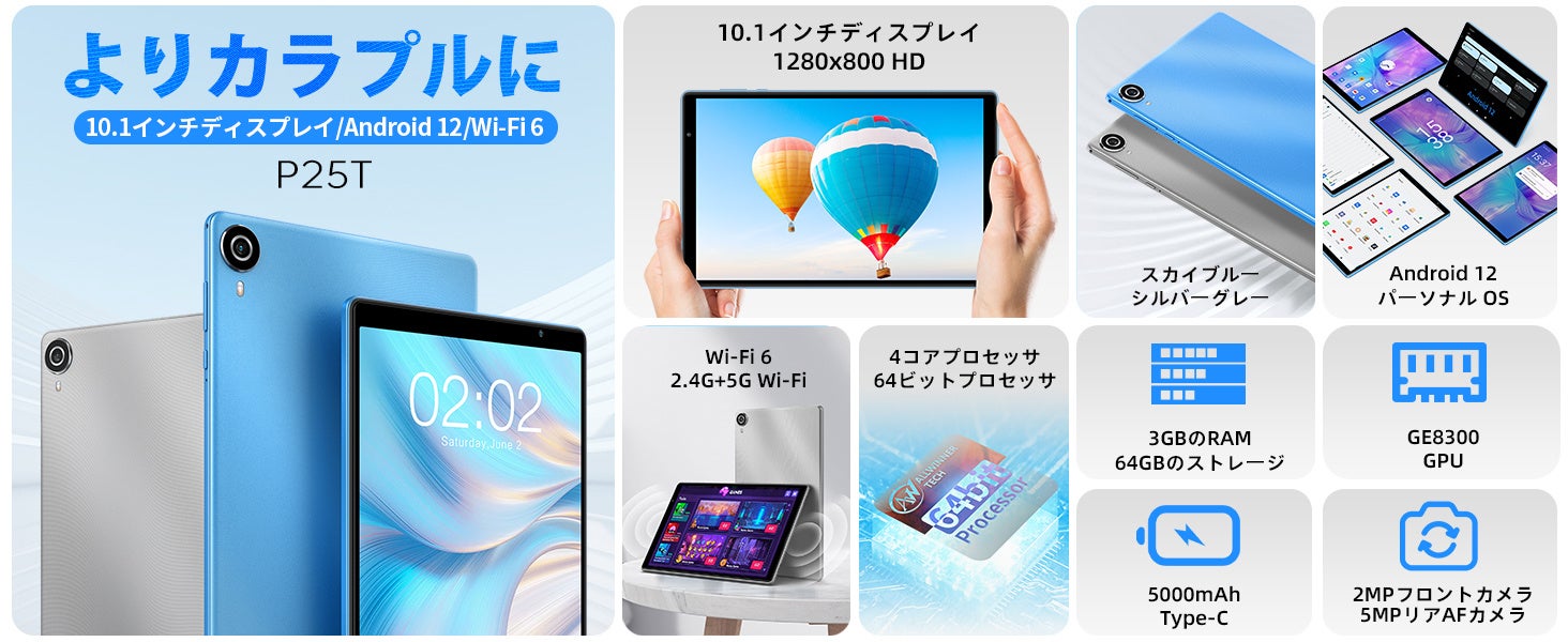 1280×800 HD解像度の10.1インチIPS 178°ワイドビューアングルディスプレイが搭載されているため、ゲームやビデオで優れたビジュアル体験が得られます。「P25T」は、Wi-Fi5より高速で大容量で低遅延の超高速Wi-Fi 6をサポートしています。エネルギー効率の高いBluetooth対応5.0により、ワイヤレスヘッドフォンで優れたオーディオを楽しむことができます。