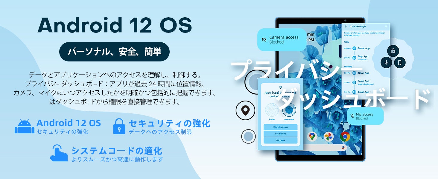 Android 12は、よりパーソナルで安全、かつ簡単なユーザー体験を提供します。 直感的なUIデザインと最適化されたシステムロジックにより、タブレットの動作がこれまで以上にスムーズになります。ユーザー情報セキュリティを考慮して設計されていますので、Android 12は、強力で使いやすいプライバシー機能を提供します。 誰がいつあなたのデータを見ることができるかを制御できるので、安心して使用できます。