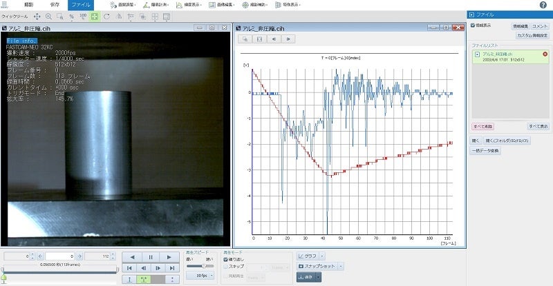 データロガーは、電圧や電流、音や力などを計測するためのセンサの値を閾値としてイベント発生を検出し、発生の瞬間を撮影することができます。オプションの再生ソフトを使えば、映像と波形を同期して再生することができます。