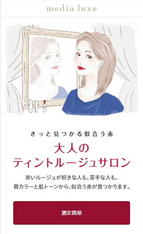 この度の導入で、「大人のティントルージュサロン」を訪れたユーザーは、ご自分のお顔を撮影して、自身の肌のトーンと、唇の色味から自分に似合うティントルージュをカンタンに見つけることが出来るようになりました。肌の色味だけではなく、唇の色も測定し、ユーザー一人ひとに合う口紅を、楽しく選んでいただけるオンラインコンテンツとなります。「明るめイエベ」「暗めイエベ」「明るめブルベ」「暗めブルベ」の4つの肌トーンと、「ピンク」、「ペール」、「パープル」、「ブラウン」の4つの唇の色タイプを掛け合わせた16のカラータイプでユーザーを分類。それぞれにお勧めのティントルージュ全6色から、印象別に2色提案し、バーチャルでお試し頂けます。