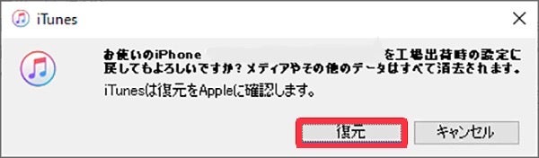 Step2:確認画面が表示されますので、「復元」をクリックします。初期化が完了すると、iTunesの画面が切り替わります。