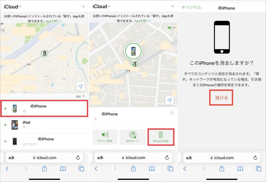 Step2:デバイスの一覧が表示されますので、初期化したいiPhone/iPadを選んで、「iPhone(またはiPad)を消去」>「続ける」の順に選択し、画面の指示に従って操作を進めると初期化できます。